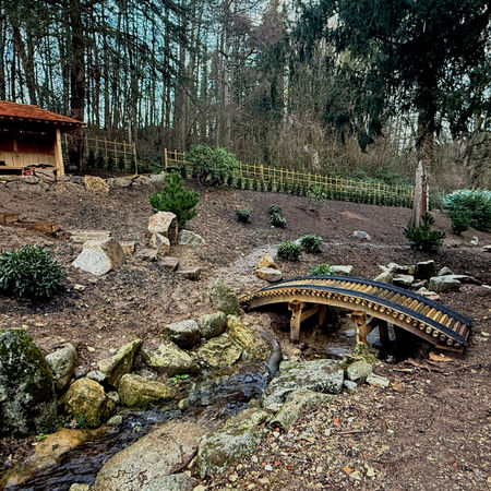 The garden is situated in Roman villa of Cotswold. A new Japanese garden is designed to define and extend the existing water features in the valley. We have done stone arrangements and landscaping with more design intentions to the existing waterfall, stream and ponds. The garden is still under the construction. We have received an earth bridge, zig zag bridge and Machiai (Vewing rest house) last year. The completion will be in 2026.