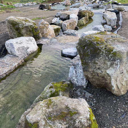 The garden consists of 2 separated water bodies. A Japanese garden with waterfalls, streams and ponds were designed to extend existing circular pond. The garden is still under the construction. The extended area was excavated to form the water features and lined to contain water. We arranged approx. 70t local stones so far and planted some Acer trees and pine trees. The completion will be sometime in 2026.